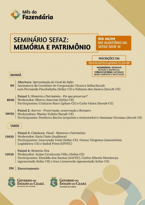 O seminário está dividido em quatro painéis, todos dialogando para despertar o olhar do público para a valorização da história fazendária. O primeiro trará para o centro das discussões o tema “Memória e Patrimônio: Por que preservar?” e contará com a participação da arqueóloga do Instituto de Patrimônio Histórico e Artístico Nacional no Ceará (Iphan CE), Cristiane Buco, e da diretora do Museu do Ceará, Carla Vieira. O servidor e autor do livro Sefaz : Tributo à História, Márcio Amorim, atuará como moderador.
