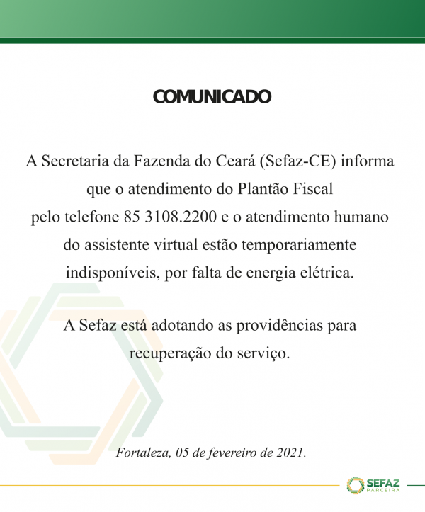 Comunicados Indisponibilidade do Plantão Fiscal 5 de fevereiro de 2021 - 10:12 Voltar ao topo Compartilhar