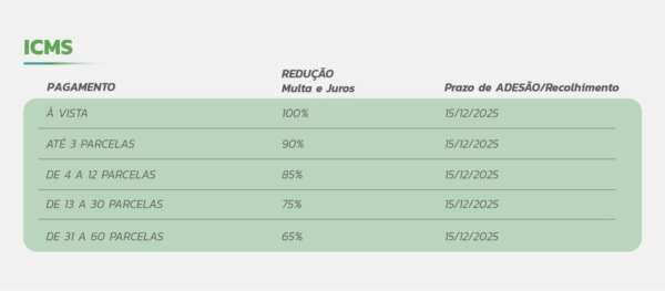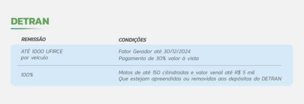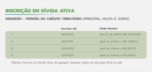 As dívidas contempladas são do Imposto sobre Circulação de Mercadorias e Serviços (ICMS), do Imposto sobre Propriedade de Veículos Automotores (IPVA), do Imposto sobre Transmissão Causa Mortis e Doação (ITCD) e de taxas do Departamento Estadual de Trânsito do Estado do Ceará (Detran).