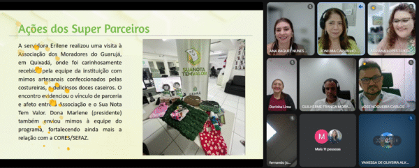 A Secretaria da Fazenda do Ceará (Sefaz-CE), por meio da Coordenadoria de Relacionamento com a Sociedade e Conformidade Tributária (Cores), realizou a quarta reunião virtual de 2025 do projeto Super Parceiros do Programa Sua Nota Tem Valor, a fim de apresentar atualizações do programa e reforçar laços de parceria entre os Super Parceiros, servidores e colaboradores fazendários disponíveis para tirar dúvidas e auxiliar na divulgação do Sua Nota.